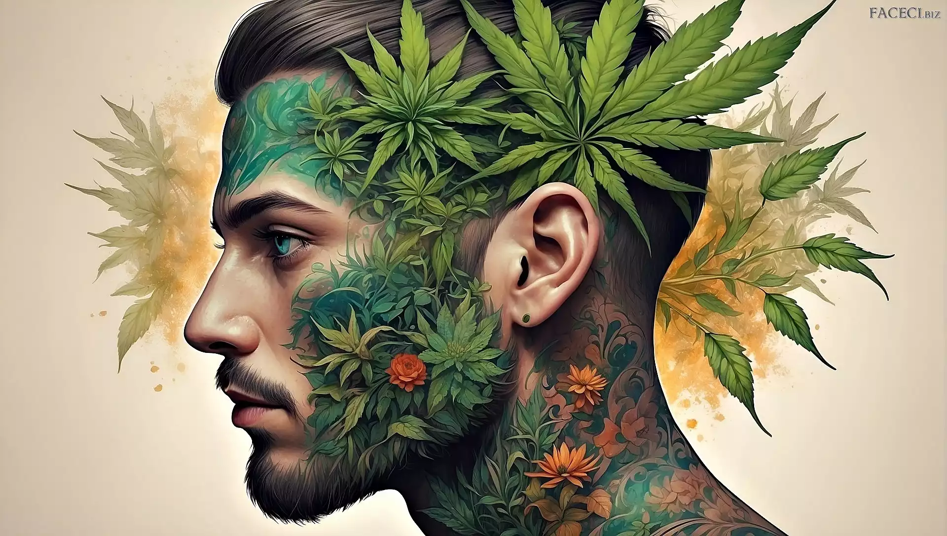 2D, Tatuaże, Mężczyzna, Profil, Listki, Kwiaty - faceci.biz